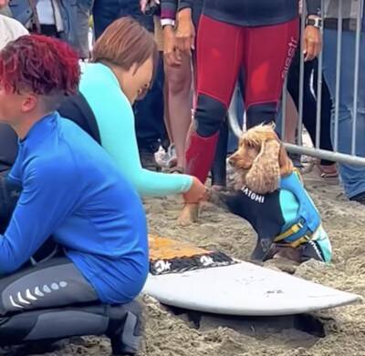 イングリッシュ・コッカー・スパニエルの『コーダ』くんは、飼い主さんと波乗りを楽しむ『サーフィン犬』として国内外で活躍しているそう。