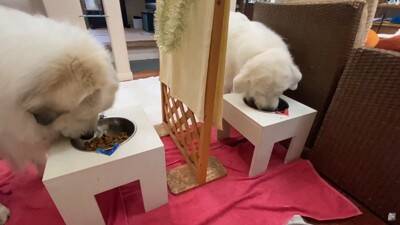 動画の主役は、グレートピレニーズの『ルンルン』ちゃんと『アラン』くん。一緒に暮らすお父さんのことが大好きなわんこたちです。ある年のお正月。起床したルンルンちゃんとアランくんは、ご飯をもらってお庭へ。