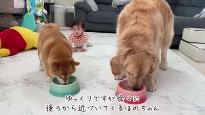 この日、ご飯を食べている2匹の背後に、ほのかちゃんがハイハイで近づいてきたといいます。ここのところ犬の存在を認識するようになったほのかちゃんは、食事中のうにくんが気になってしまったよう。ジリジリと距離を詰めていき、横腹にコツンと頭を付けたのでした。