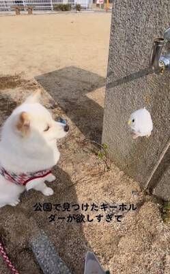 ポメラニアン×柴犬、通称ポメ柴の「べら」ちゃんは、この日いつものようにママさんと公園にお散歩へ。すると水飲み場の蛇口に引っかかっていた『フクロウのキーホルダー』を発見したそう。