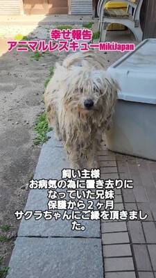 手術が終わって落ち着いてきたころ、ついにサクラちゃんに里親さんが見つかったのです。一緒に保護されたゆずくんには、すでに新しい家族が決まっていたところ。後を追うようにして、サクラちゃんも第2の犬生を迎えられたのでした。