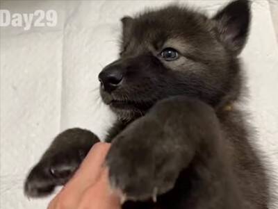 Xアカウント『@blackashwolfdog』に投稿されたのは、ウルフドッグ「シグルズ(Sigurdr)」くんのお姿。生後29日、出会ったばかりの頃のシグルズくんは、ふわふわの毛につぶらな瞳、まるでぬいぐるみのようなお姿をしていたのだそう。