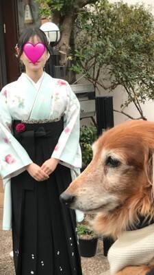 Xアカウント『@kantakanta1234』に投稿されたのは、ミニチュアダックスフンド「かん太」くんと、大学の卒業式を迎えたお姉ちゃんのお姿。