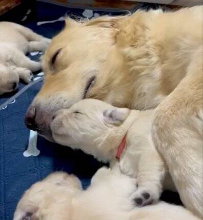 Xアカウント『@pu_channeldesu』に投稿されたのは、ゴールデンレトリバー「つゆ」ちゃんとその子どもたちのお姿。2025年3月11日、つゆちゃんは7頭の尊い命を産み落とされたのです。