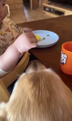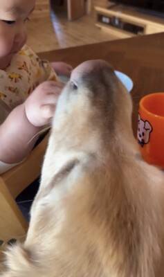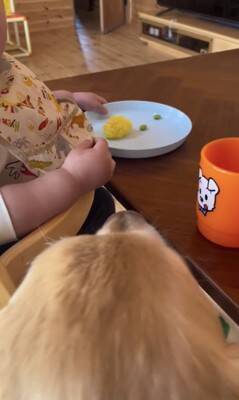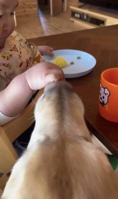 1歳になる赤ちゃんの隣にオスワリしているのは、ゴールデンレトリバーの男の子「レア」くん。とっても仲の良い2人ですが、仲良しすぎた結果、一緒にある「たくらみ」をしていたのだそう。