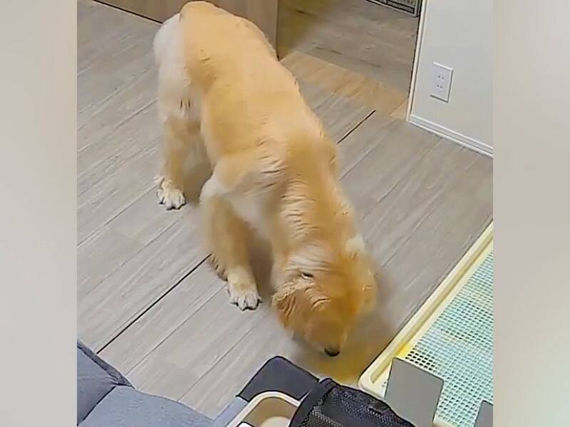 今回の主役は、ゴールデンレトリバーの『コロッケ』ちゃん。部屋に設置されたトイレトレーからおしっこがはみだしてしまった瞬間を、ペットカメラによって撮影されてしまいました。コロッケちゃんは、失敗したことに驚いて一旦キャリーに入ってしまったそうです。