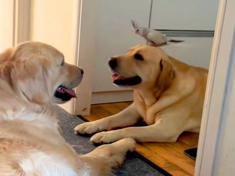 TikTokアカウント「yunataaan___」の投稿主さんは、ゴールデンレトリバーの『アッシュ』ちゃんと、ラブラドールレトリバーの『レイス』ちゃんという2匹の大型犬と暮らしています。ある日、2匹が向かい合ってくつろいでいると…。そこにやってきたのは、オカメインコの『部長』ちゃん!