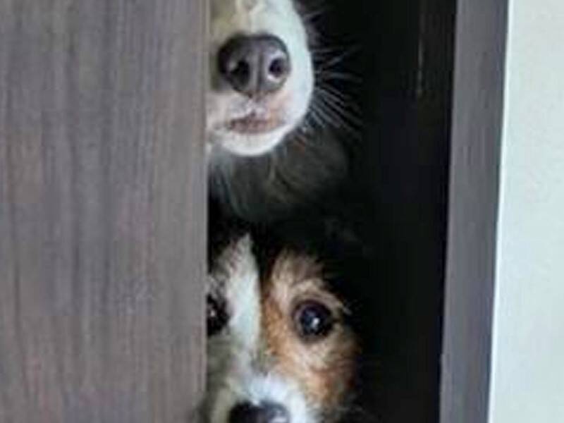 『入ってはいけないお約束』をしているお部屋の引き戸…少しだけ開いたその隙間から、縦一列に並んで覗き込んでいたのは、ジャック・ラッセル・テリアの「Charlotte」ちゃんと「Eliseva」ちゃん、ボーダー・コリー「Pénélopé」ちゃんのお姿。