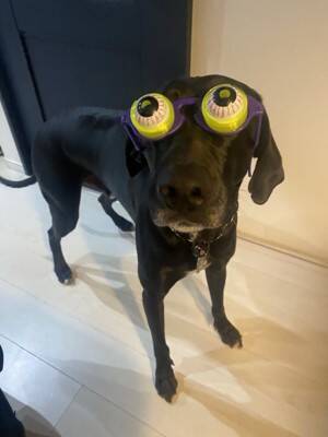 この日、飼い主さんはパーティー用のサングラス、血走った目玉が飛び出しているように見えるおもしろグッズをソルくんに付けてみることにしたのだそうです。
