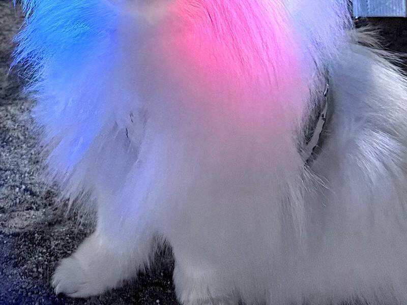 真っ白でモフモフのおもちちゃんのお首周りが赤、緑、青、ピンク、水色…と、色を変えて光るそのお姿は、言葉の通り『イルミネーション』と表現するにふさわしいもので、ポジティブで微笑ましいその発想に、おもちちゃんもどこか誇らしげな表情を浮かべていた模様。