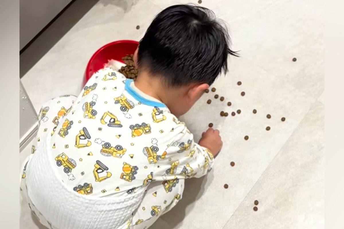 床に散らばってしまったワンコのごはん。男の子が懸命に拾い集めているすぐ後ろでは、大型犬がじっと様子を見守っていたといいます。
