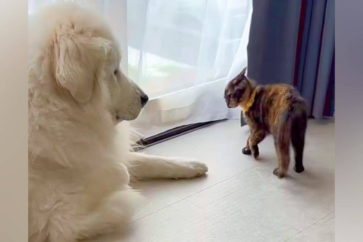 TikTokアカウント「kabayaki_1220」に投稿されたのは、家にやってきた元野良猫の「にょにょふく」に喧嘩を売られたグレートピレニーズ「なんなん」の様子。にょにょふくは他の方に保護され、この度飼い主さんの家へやってきたのだそう。