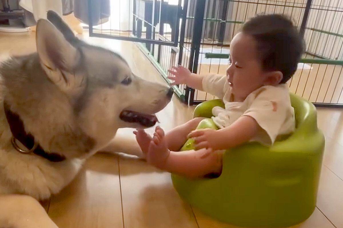 何かを伝えたくて突然泣きだしてしまった弟くん。そんな弟くんの姿を見たスノウくんは、自分の顔を弟くんにそっと近づけ、弟くんの手を優しくペロペロと舐め始めたのだとか!すると、弟くんの泣き声はどんどんと小さくなっていったそう。