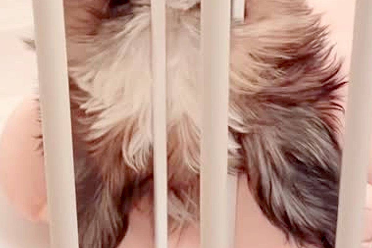 Instagramアカウント「b_oto_b」に投稿されたのは、赤ちゃんシーズーの「おと」ちゃんがお水を飲む姿です。おとちゃんはサークルに取り付けてある給水器からお水を飲んでいるのですが、注目すべきはその個性的な飲み方。なんと給水器に背を向けて座り、思い切り上半身を反らせてノズルを舐めていたのです!