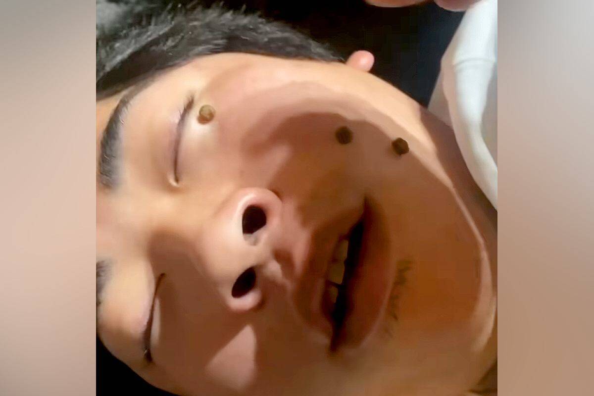どうやらそれは、“ワンコに起こしてもらう作戦”のようです。男性の顔の上に、そっと置かれていく犬用のおやつ。位置を選びながら、落ちないようにそっと並べられていく様子が。ワンコにとっては、目の前に大好物が現れる状況でしたが、すぐに飛びつくことはありませんでした。