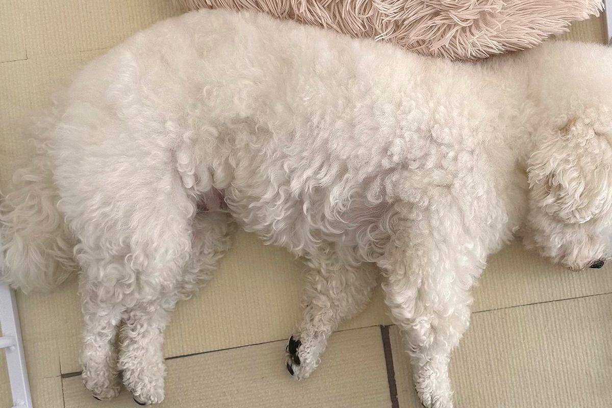 ケージの中でスヤスヤと眠っているふわふわのビションフリーゼさん。頭の部分をよく観察してみると…ふわふわだからこその光景が話題になっています。