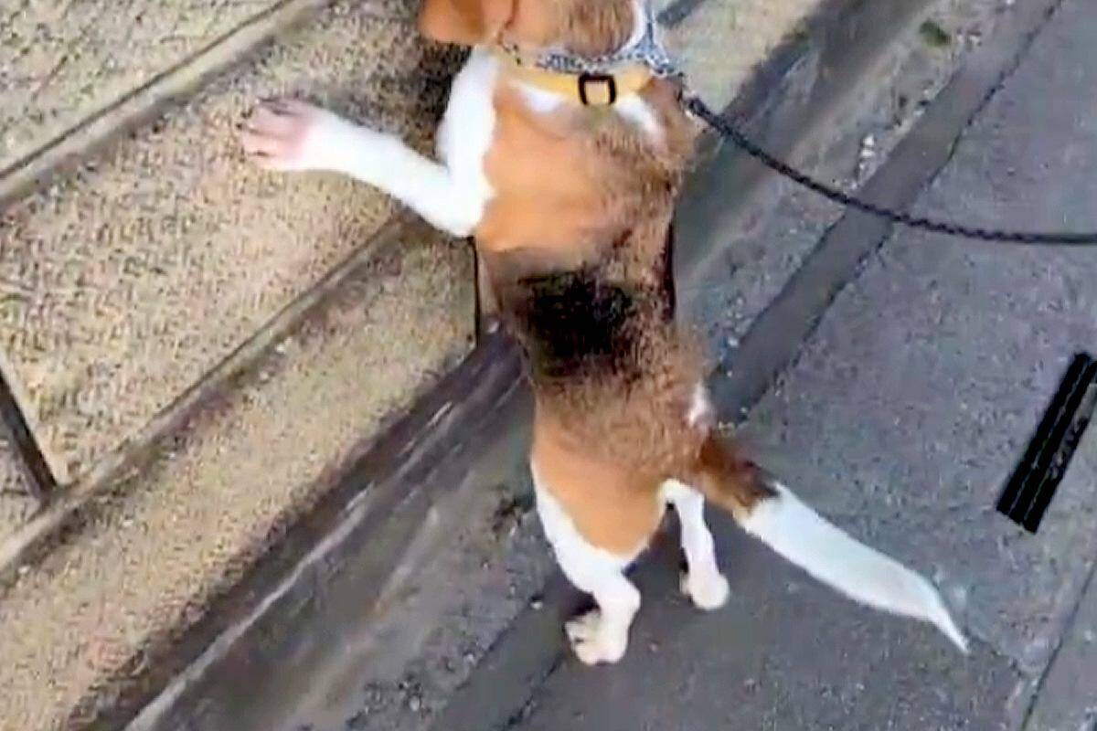 散歩中、壁の向こうに『犬がいる』ことに気付いたビーグル犬