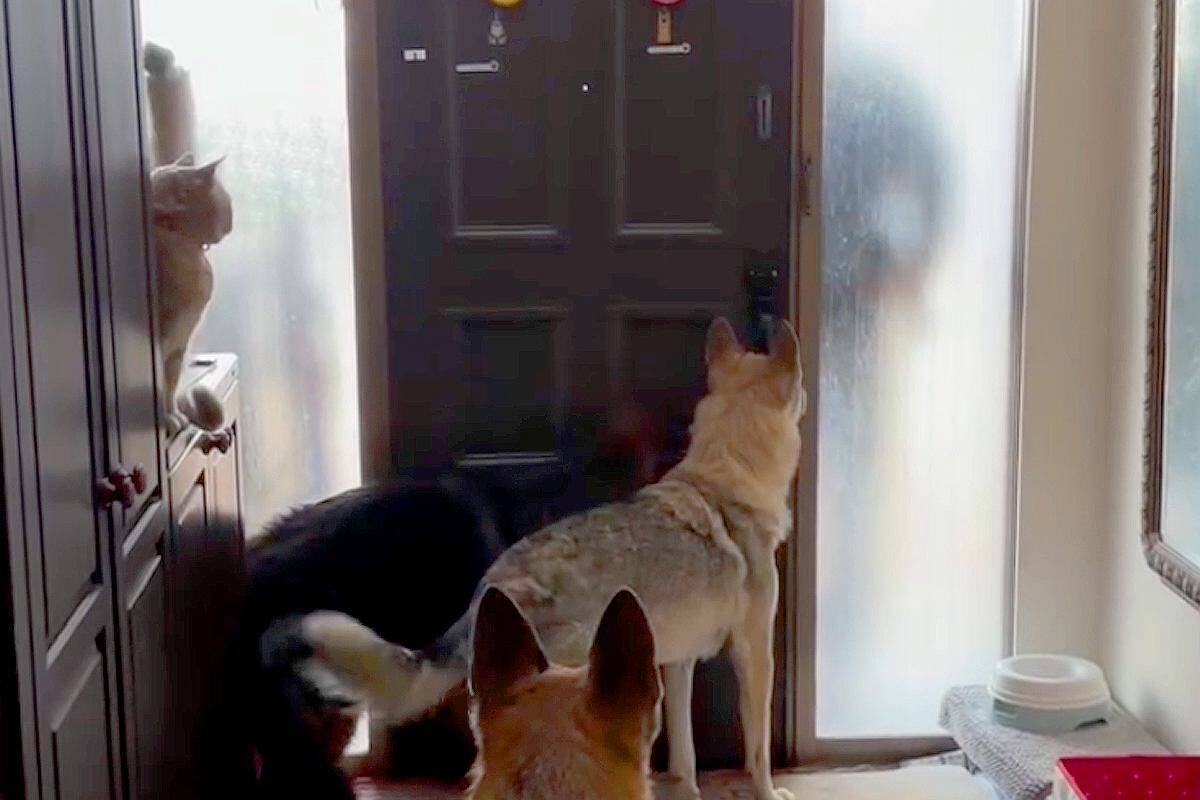 外から車の音が聞こえると「パパが帰ってきた!」と察知して、大型犬3匹+猫1匹が玄関に大集合!猫のマイキーくんは靴箱の上で静かに待機していたのですが、大型犬たちはソワソワしていて、ドアに飛びついて開けようとする子もいたとか。パパさんに早く会いたくて待ちきれない様子が、なんとも可愛らしいです。