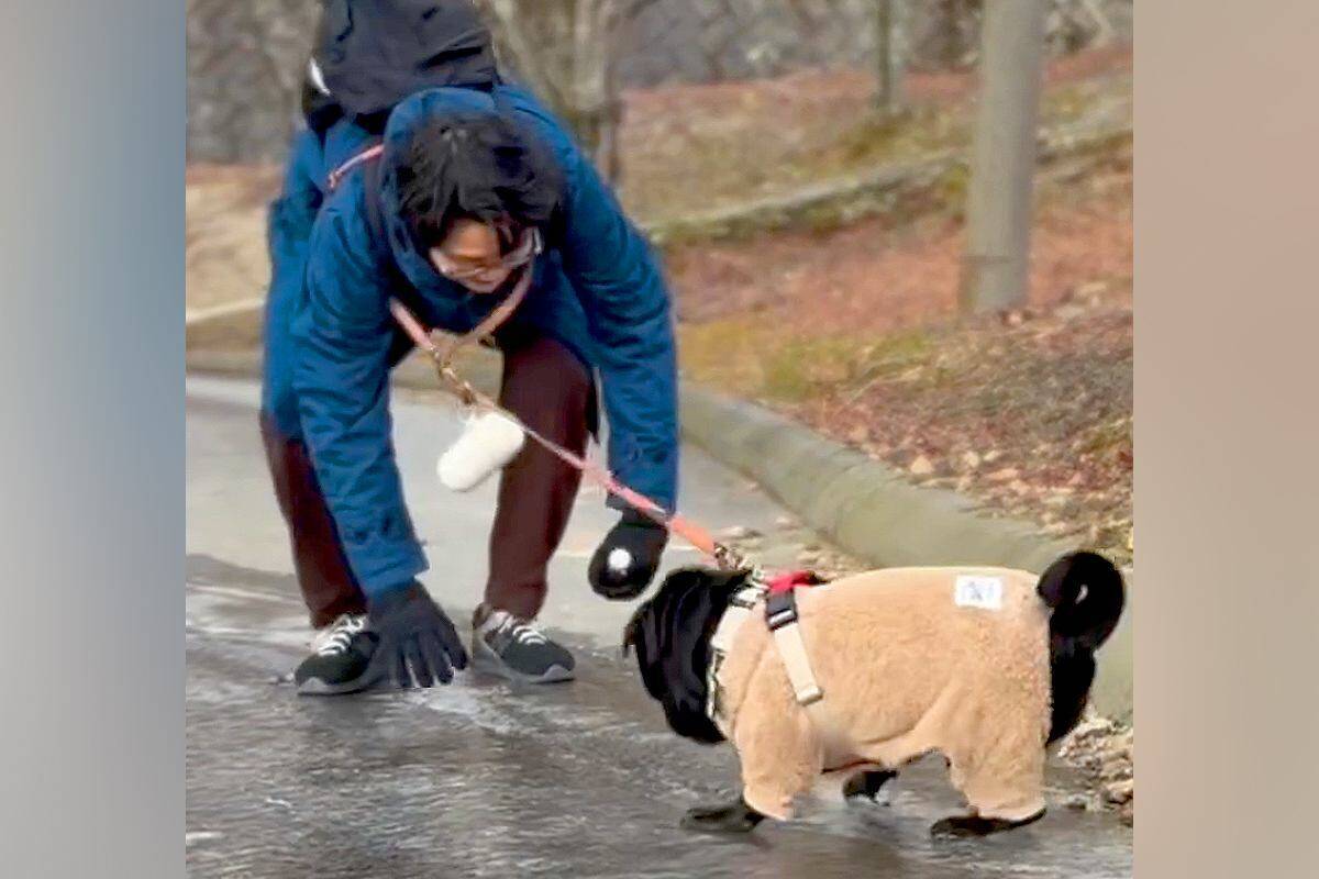 この日はパグの「源」くんとパパさんはお出かけ中で、一緒に駐車場に戻るところだったのだそう。しかし、ルート上に、凍っている場所が……!