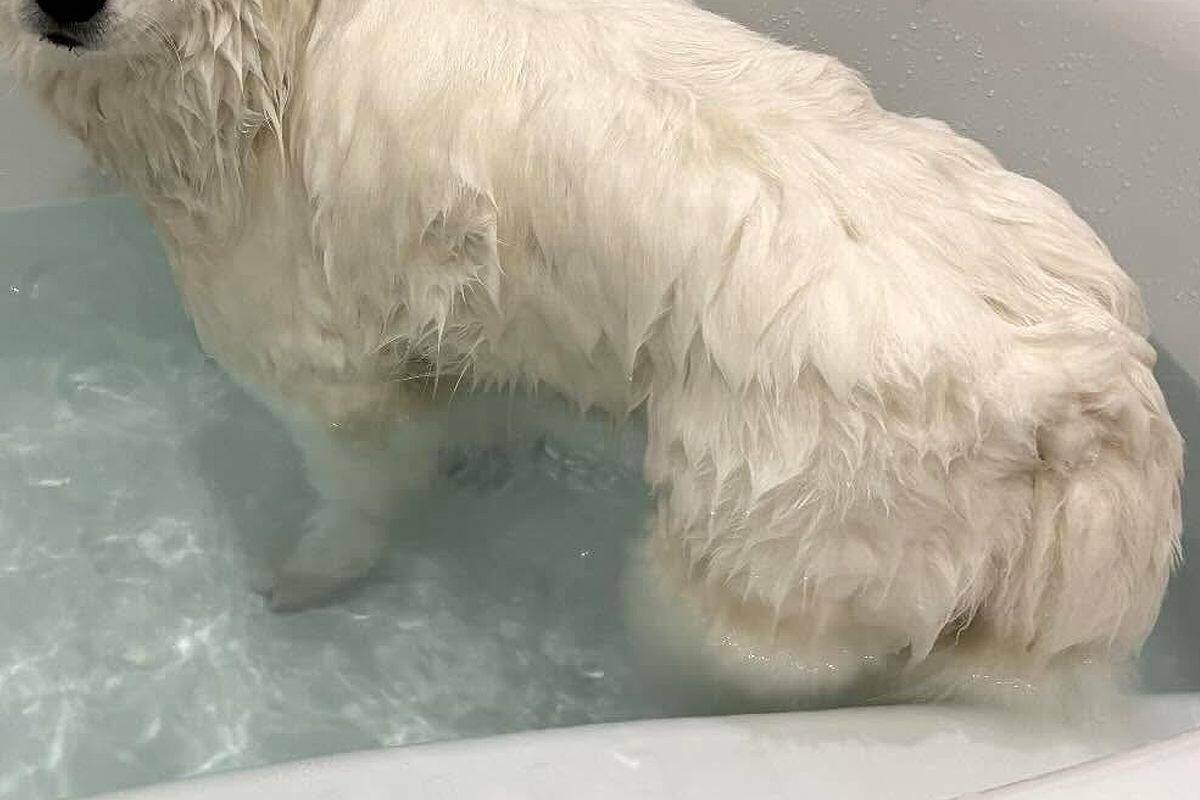 Threadsアカウント「myhome_2023.7」の投稿主さんは、『くらら』ちゃんというサモエドと暮らしています。今回は、くららちゃんをお風呂に入れたときの様子を紹介したそうです。くららちゃんは、バスタブの中でゆったりとお湯に浸かっていました。