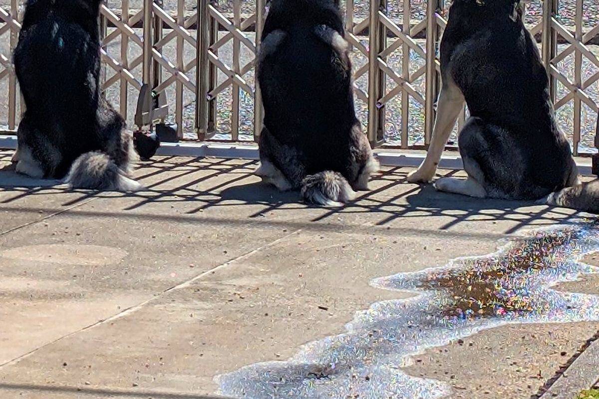 自宅の門扉前にピシッと並んで自宅警備に励む3頭のシベリアンハスキーさんの後ろ姿。ハスキーファンにはたまらない、圧巻の光景が話題になっているのです。