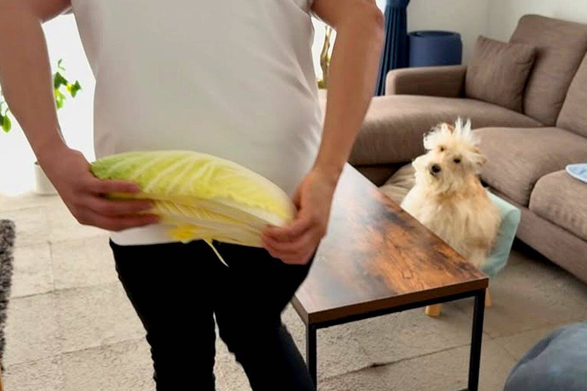 ゴキゲンな足取りでわんわんちゃんに近づいた大地さん。その背後には、白菜が隠されていました。わんわんちゃんは白菜が大好物で、時折おやつとして与えることがあるそうです。突然、白菜を差し出されたわんわんちゃんは、静かに歓喜!ピョンと立ち上がり、パクリとかぶりついたといいます。