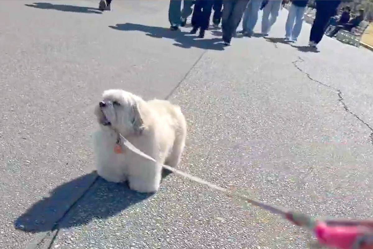 お散歩中、意気揚々と歩いていたはずなのに突然立ち止まってしまうワンコ。後ろからは続々と人が歩いてきていて…。