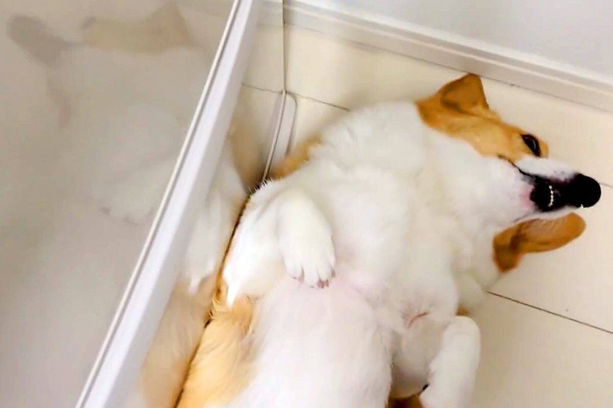 冷蔵庫のドアの前、ヘソ天でぐっすりと眠るコーギーさん。ドアを開けるためには…可愛すぎる『絶対的なルール』を捉えた映像は海外から多くの反響を呼ぶこととなったのです。