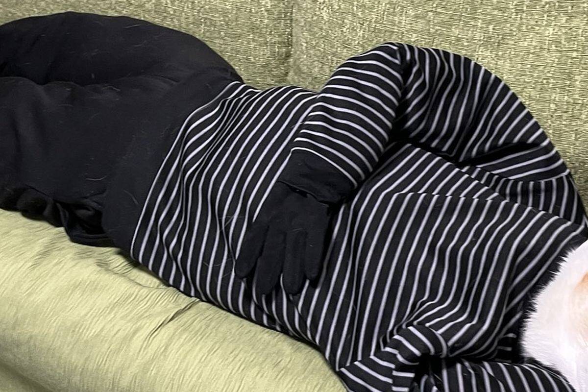 飼い主さん曰く、ソファに寝転がる閣下くんにお洋服を着せ、靴下やズボンを並べて置いても微動だにしなかったという閣下くん。