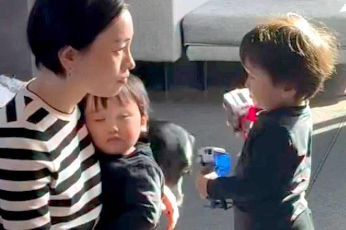 母親が男の子に言い聞かせる中、どんちゃんは二人のちょうど間に入り込む形に。どちらか一方に寄るのではなく、絶妙な距離感でその場を見守っていたそうです。その落ち着いた立ち姿からは、さりげない気遣いが伝わってくるようでした。