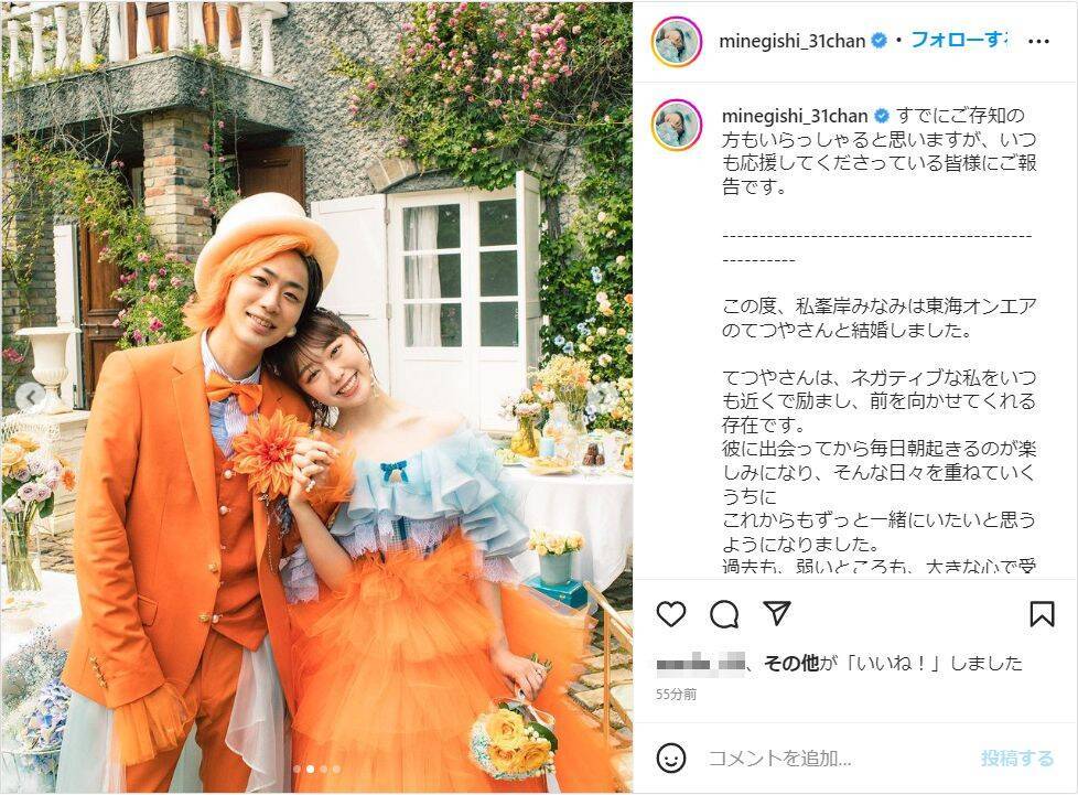 峯岸は「すでにご存知の方もいらっしゃると思いますが、いつも応援してくださっている皆様にご報告です。」と書き出し、「この度、私峯岸みなみは東海オンエアのてつやさんと結婚しました。」と報告。オレンジ色のドレス姿の峯岸と、てつやも同じくオレンジ色のスーツ姿で仲良く寄り添う2ショットを披露した。