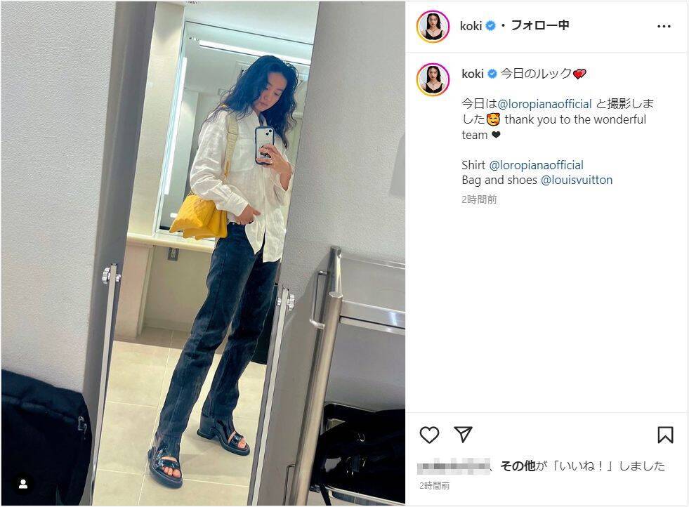 Koki,は「今日は@loropianaofficial と撮影しました thank you to the wonderful team」と報告し、写真を投稿。イタリアの高級衣料品ブランド「ロロピアーナ」の白いシャツをメインにデニムを合わせ、バッグと靴は「ルイ・ヴィトン」と紹介し、シンプルながらも上品な装いを披露した。