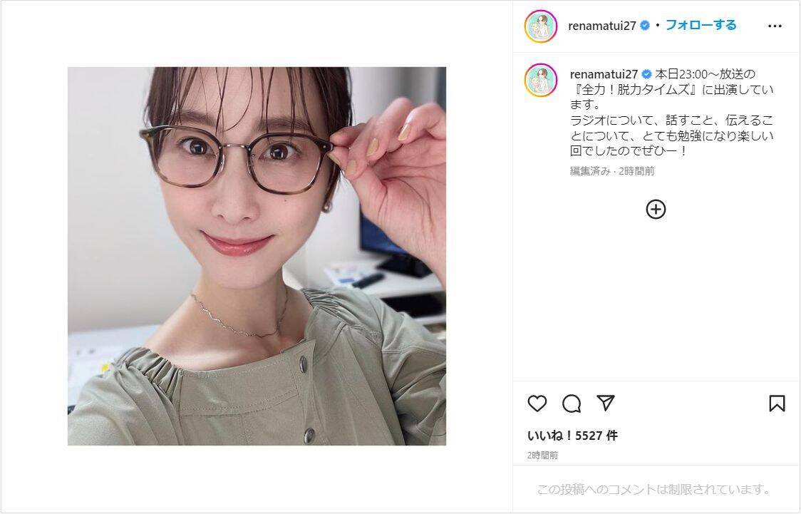 松井は「本日23:00~放送の『全力!脱力タイムズ』に出演しています。」と記し、写真を投稿。メガネをかけて微笑んだ自撮りショットを披露し、「ラジオについて、話すこと、伝えることについて、とても勉強になり楽しい回でしたのでぜひー!」と呼びかけた。