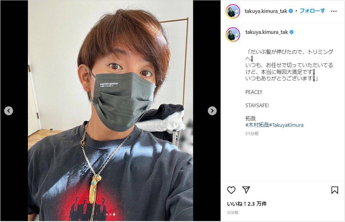 俳優の木村拓哉が31日(水)、自身のインスタグラムを更新。ヘアカットした新ヘアスタイルを公開した。
