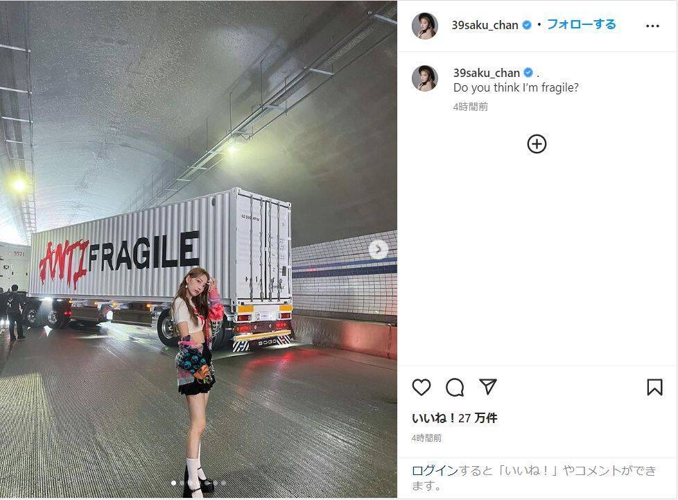 宮脇は「Do you think I’m fragile?」とつづり、写真を投稿。お腹を出したショート丈の白トップスに黒のミニスカートを着用し、すらりと伸びた美脚を披露した。