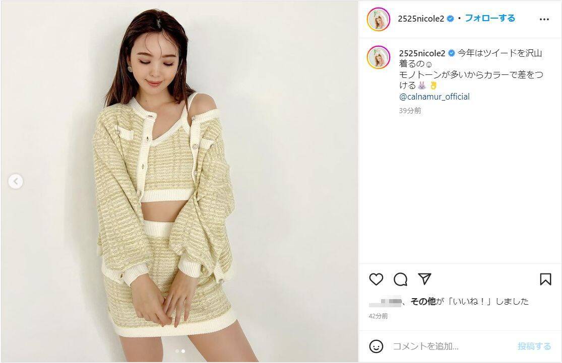 藤田は「今年はツイードを沢山着るの モノトーンが多いからカラーで差をつける」とつづり、写真を投稿。ツイード素材のセットアップを着用し、ショート丈のキャミソールやミニスカートで大人っぽく肌見せしたコーデを披露した。