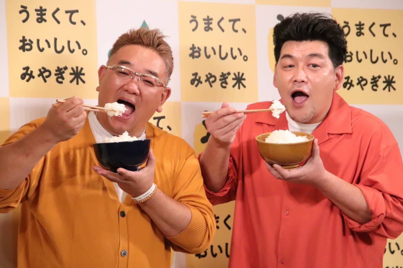 28日(水)、お笑いコンビ・サンドウィッチマンの伊達みきおと富澤たけしが、「令和4年産宮城米説明会および新CM発表会」に出席。自身出演の新CMお披露目や、宮城米にまつわるトークを展開した。