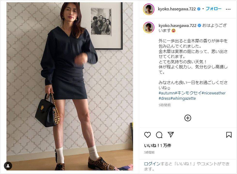 長谷川は「外に一歩出ると金木犀の香りが体中を包み込んでくれました。金木犀は実家の庭にあって、思い出させてくれます。とても気持ちの良い天気!体が程よく脱力し、気分も少し高揚して。みなさんも良い一日をお過ごしくださいね」とつづり、写真を投稿。ダークカラーのワンピースを着用し、すらりと伸びた美脚を見せた大人の秋コーデを披露した。