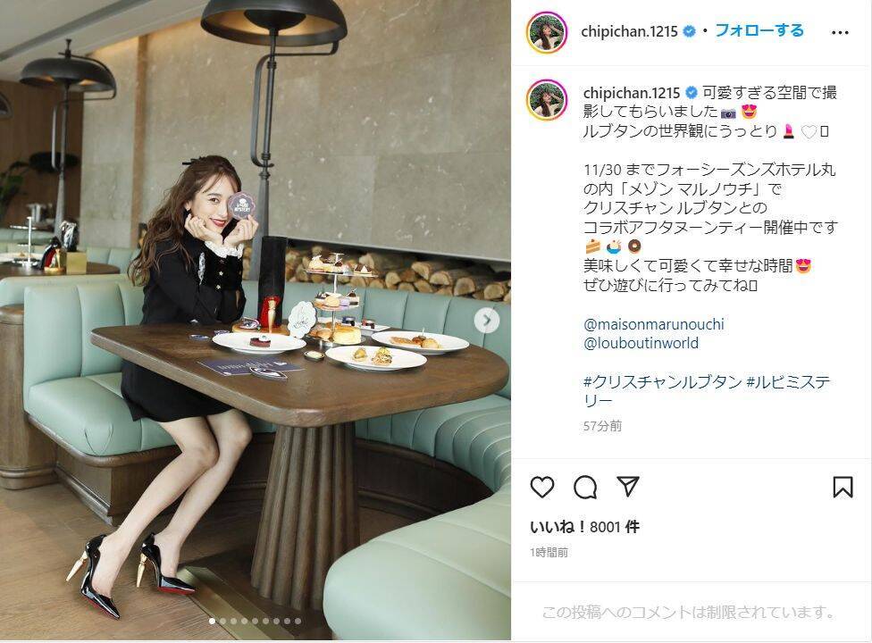近藤は「可愛すぎる空間で撮影してもらいました ルブタンの世界観にうっとり」と記し、写真を投稿。レースがデザインされたクラシカルな黒のミニワンピースを身にまとい、足元はクリスチャン ルブタンのピンヒールを合わせてスラリと伸びた美脚を披露し、「11/30 までフォーシーズンズホテル丸の内『メゾン マルノウチ』でクリスチャン ルブタンとのコラボアフタヌーンティー開催中です 美味しくて可愛くて幸せな時間 ぜひ遊びに行ってみてね」と呼びかけた。