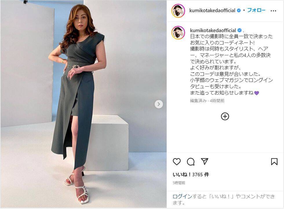 女優の武田久美子が6日(木)、自身のインスタグラムを更新。スリットの入った衣装で美脚を公開した。