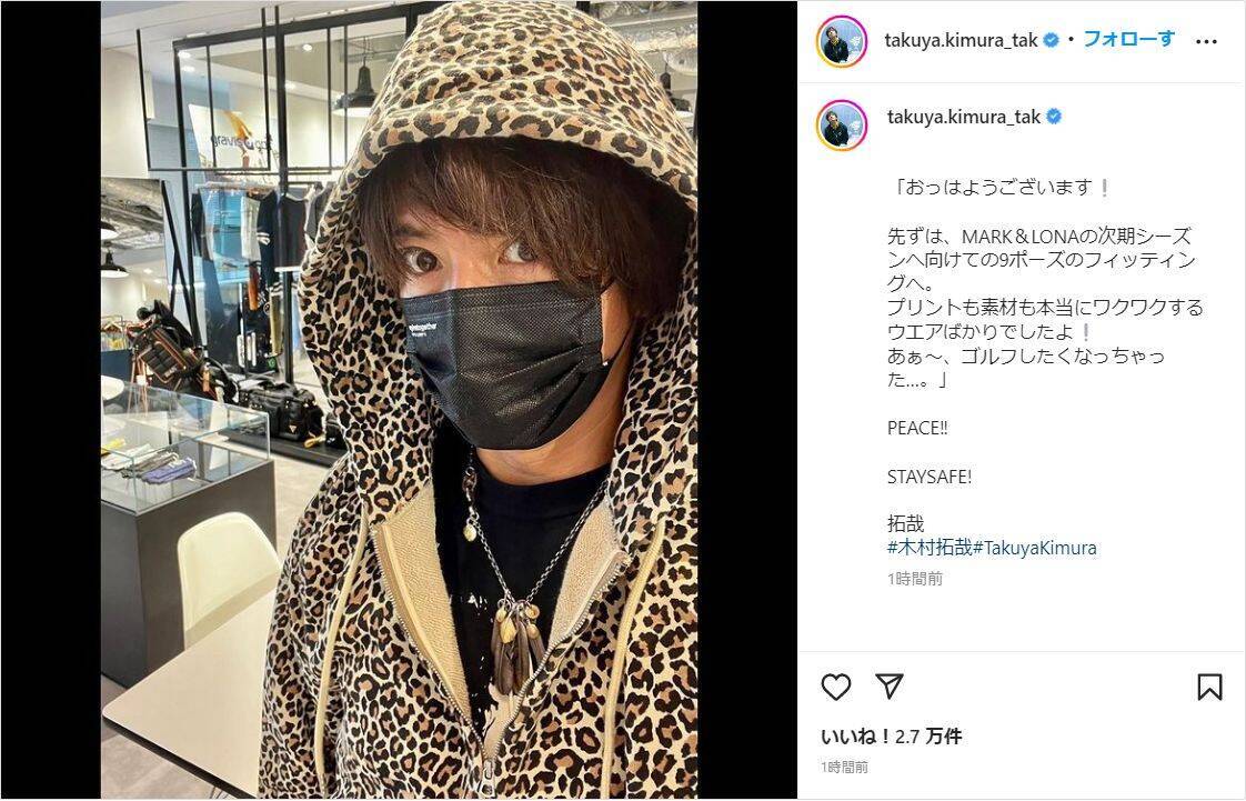 俳優の木村拓哉が14日(金)、自身のインスタグラムを更新。ヒョウ柄コーデを公開した。