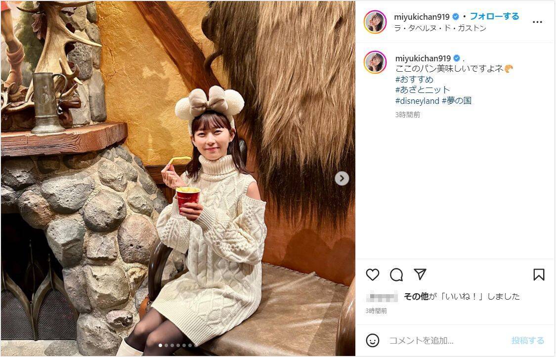 渡辺は「ここのパン美味しいですよネ」と記し、東京ディズニーランドを訪れた際のオフショットを投稿。ハッシュタグで「#あざとニット」とつづり、肩の部分が開いた肌見せデザインのニットワンピース姿で、ミニーマウスのカチューシャを着けたコーデを披露した。