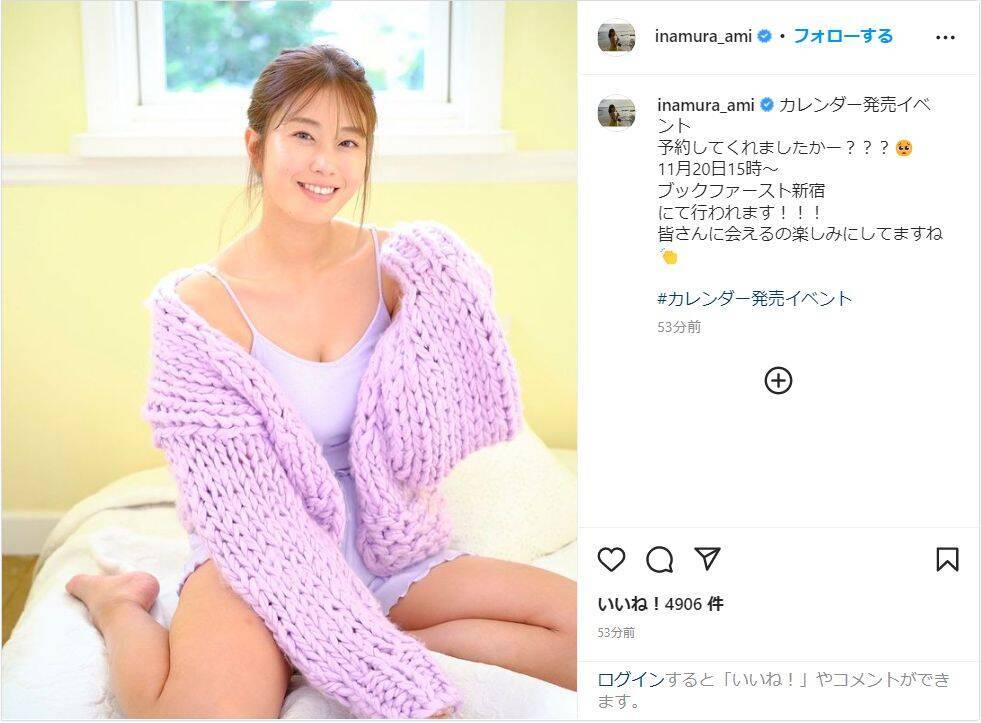 稲村は「カレンダー発売イベント 予約してくれましたかー???」と記し、写真を投稿。キャミソールとショートパンツにカーディガンを羽織った姿で、胸元や太ももを露出した大胆ショットを披露し、「11月20日15時~ ブックファースト新宿にて行われます!!!皆さんに会えるの楽しみにしてますね」とつづった。
