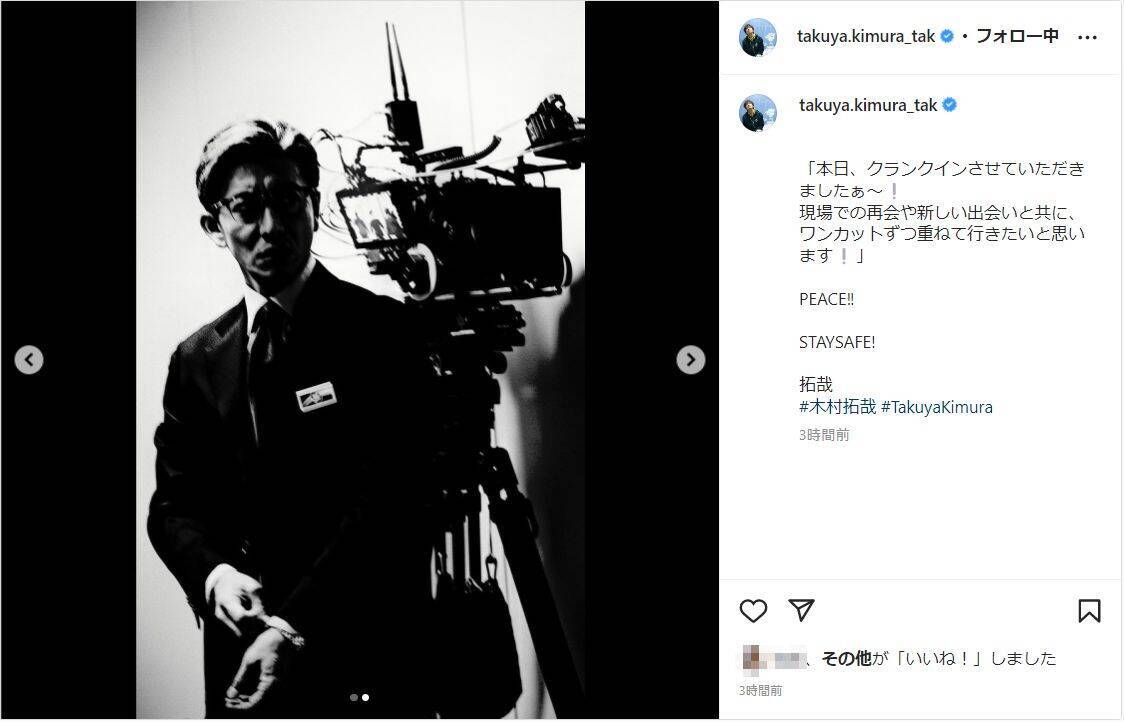 俳優の木村拓哉が25日(金)、自身のインスタグラムを更新。ドラマのクランクイン報告をした。