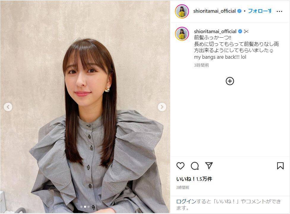 玉井は「前髪ふっかーつ!!」と記し、写真を投稿。これまでのおでこを出したヘアスタイルから前髪をカットしてイメチェンした姿を披露し、「長めに切ってもらって前髪ありなし両方出来るようにしてもらいました my bangs are back!!! lol」とつづった。