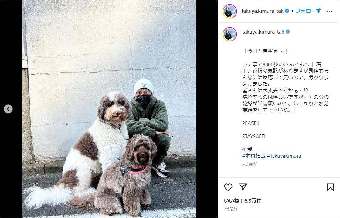 俳優の木村拓哉が4日(水)、自身のインスタグラムを更新。愛犬との散歩ショットを公開した。