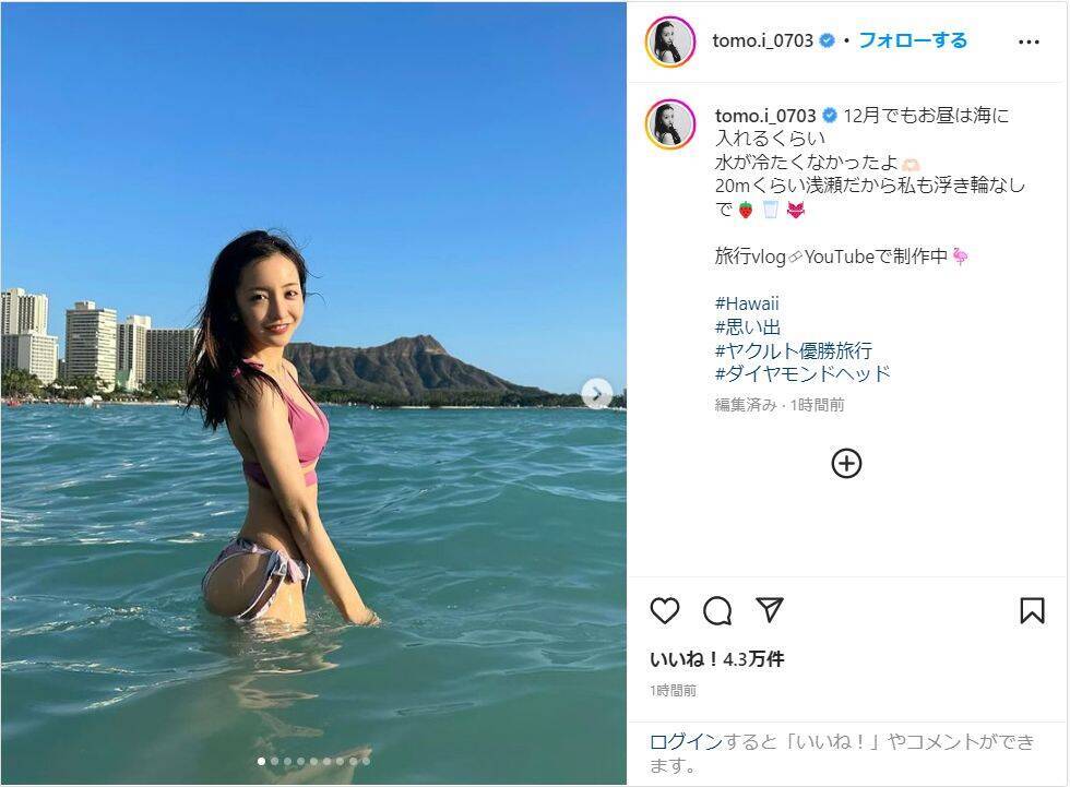 板野は「12月でもお昼は海に入れるくらい水が冷たくなかったよ 20mくらい浅瀬だから私も浮き輪なしで 旅行vlog YouTubeで制作中」と記し、写真を投稿。ピンク色のビキニ姿で海に入るオフショットを披露し、「#Hawaii #思い出 #ヤクルト優勝旅行 #ダイヤモンドヘッド」とハッシュタグを添えた。
