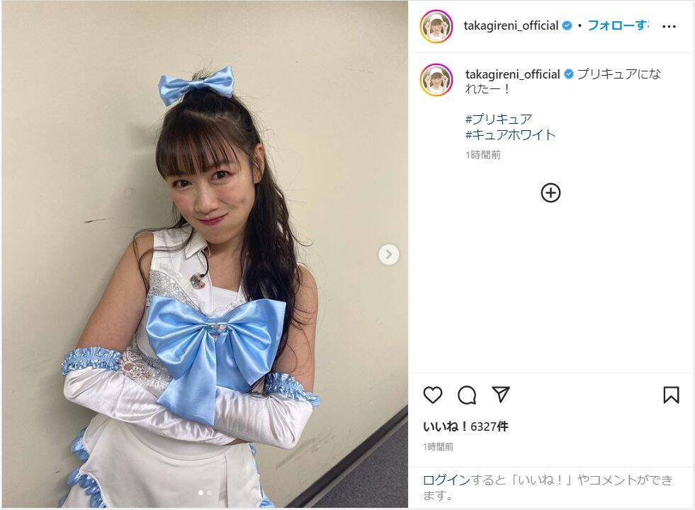 高城は「プリキュアになれたー!」とつづり、写真を投稿。アニメ『ふたりはプリキュア』に登場するプリキュア・キュアホワイトの衣装姿を披露した。