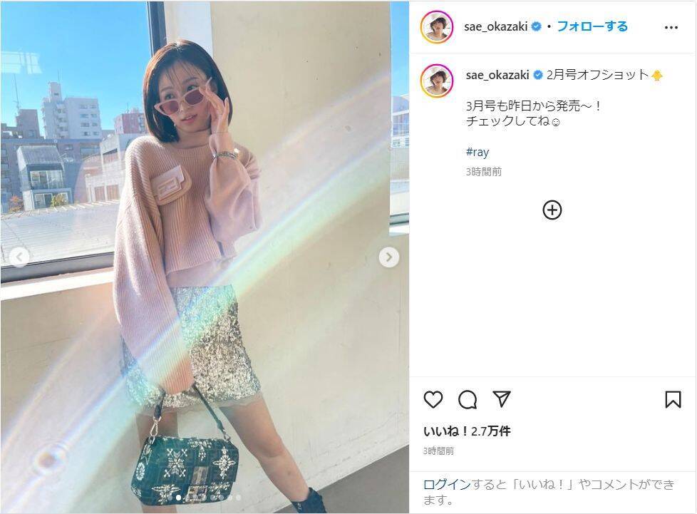 岡崎は「2月号オフショット 3月号も昨日から発売~!チェックしてね」とつづり、写真を投稿。自身が専属モデルを務める「Ray」の撮影で、サングラス姿でのミニスカートコーデやニット帽コーデ、ミニ丈のボトムスにロングブーツを合わせたコーデでのオフショット披露した。