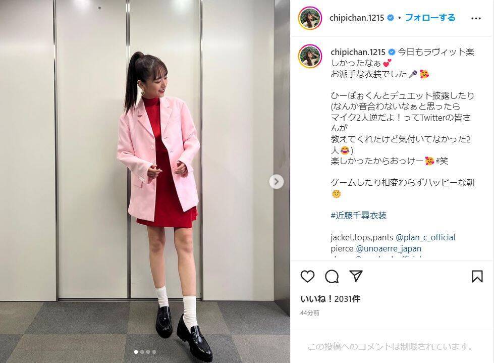 近藤は「今日もラヴィット楽しかったなぁ お派手な衣装でした」と記し、写真を投稿。ポニーテールヘアにピンクのジャケット、上下赤で統一した衣装で、ミニスカートからすらりと伸びた美脚を披露し、「ひーぼぉくんとデュエット披露したり(なんか音合わないなぁと思ったらマイク2人逆だよ!ってTwitterの皆さんが教えてくれたけど気付いてなかった2人)楽しかったからおっけー笑 ゲームしたり相変わらずハッピーな朝」と振り返った。